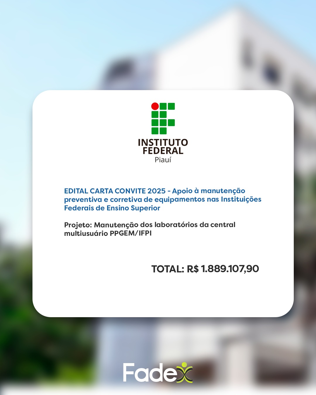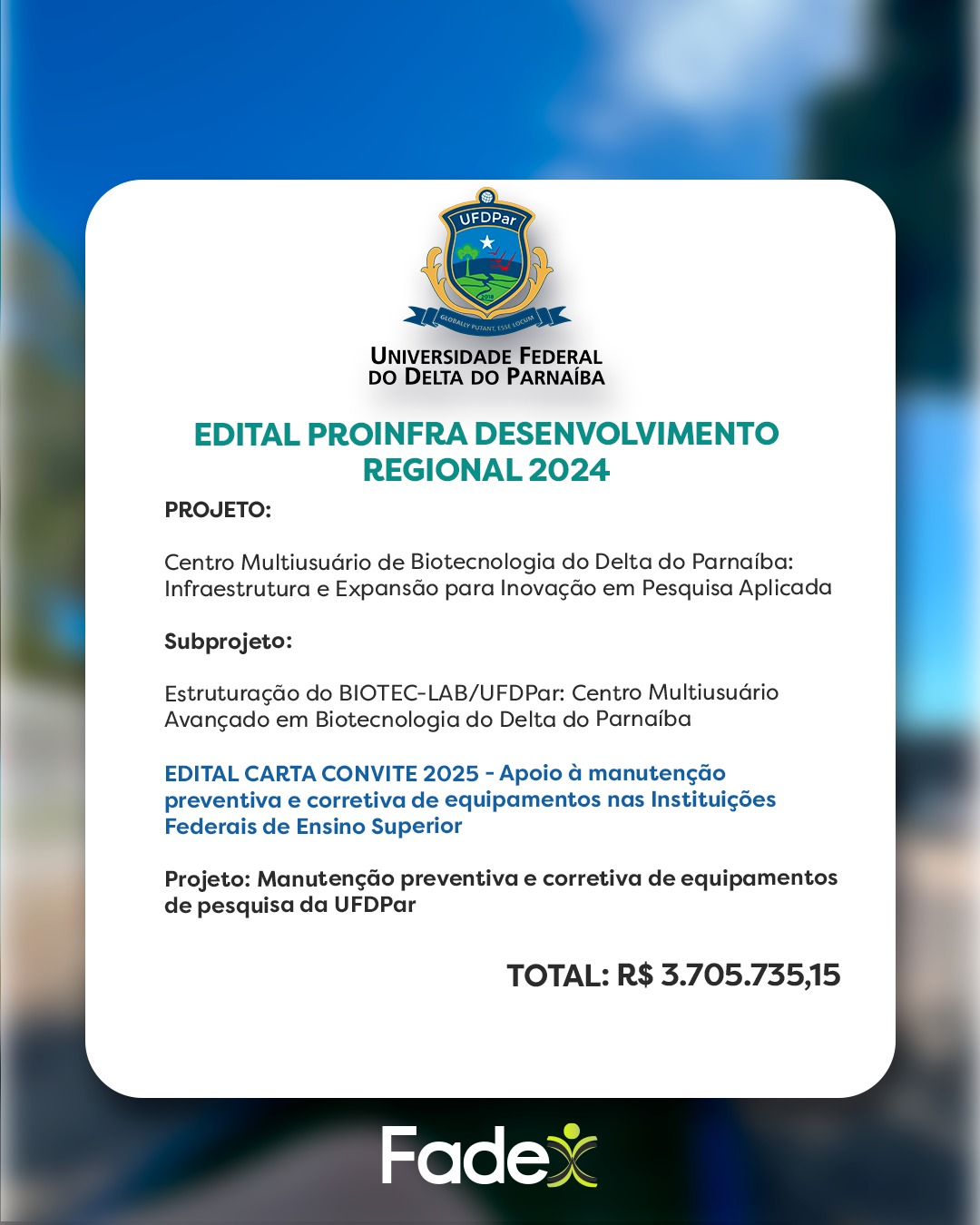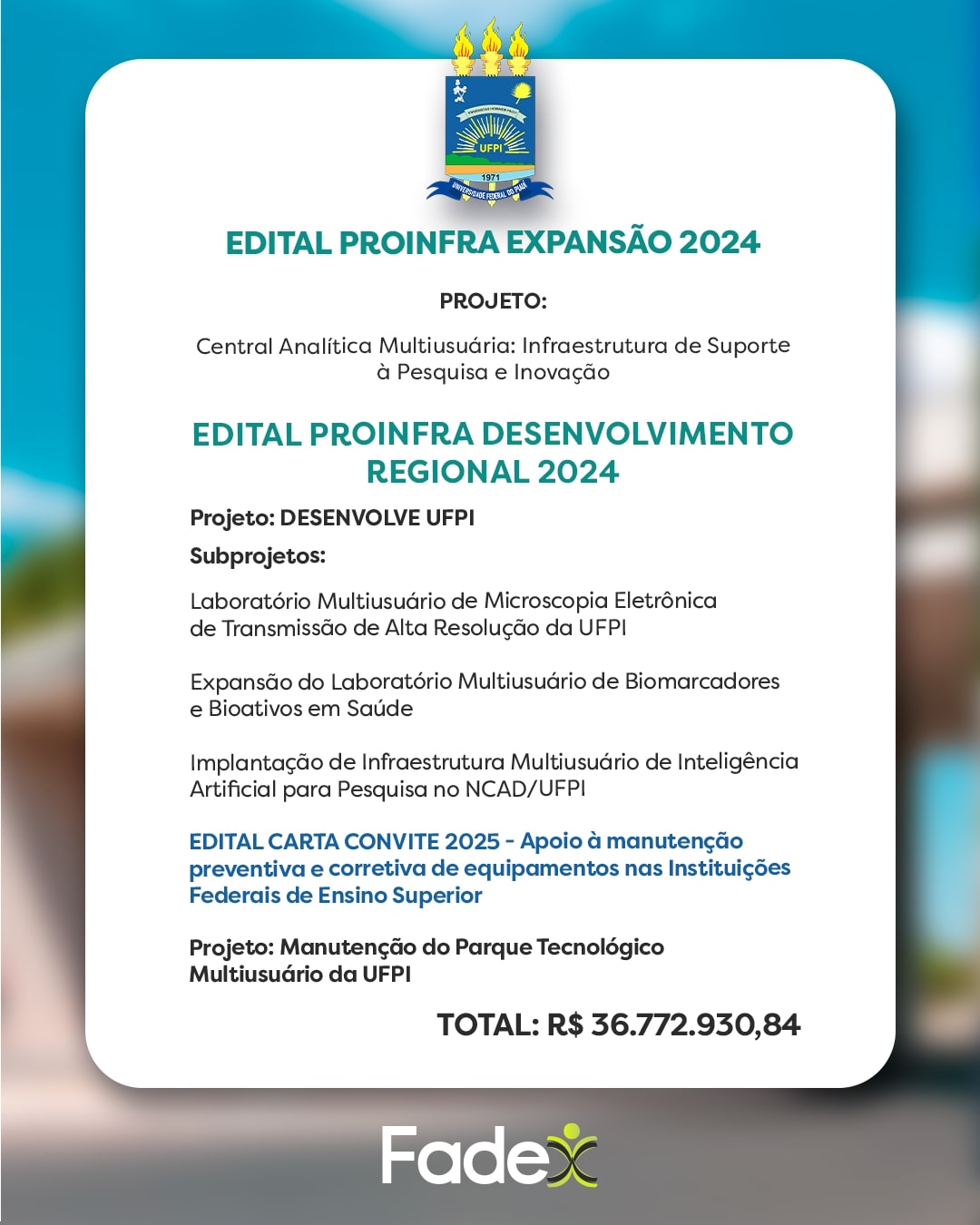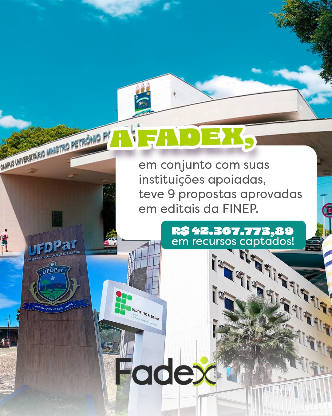 A Fundação Cultural e de Fomento à Pesquisa, Ensino, Extensão e Inovação (FADEX) obteve aprovação de 9 projetos em 3 editais de financiamento para a Universidade Federal do Piauí (UFPI), Universidade Federal do Delta do Parnaíba (UFDPAR) e para o Instituto Federal do Piauí.