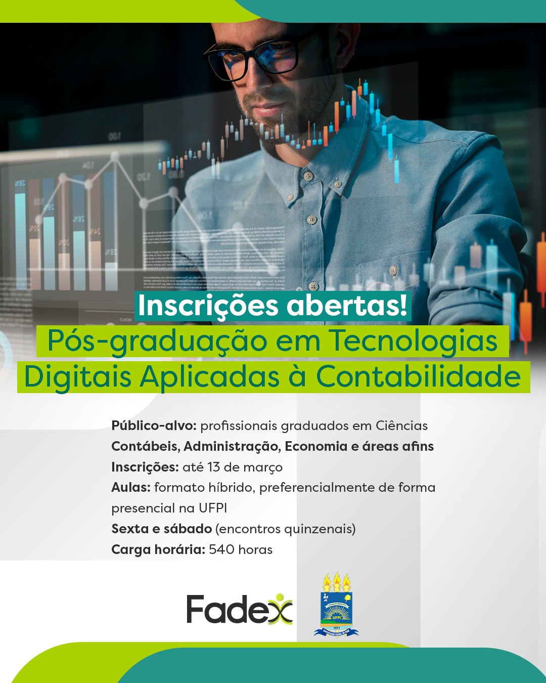 A Universidade Federal do Piauí (UFPI), através da Pró-Reitoria de Ensino de Pós-Graduação (PRPG) e do Curso de Bacharelado em Ciências Contábeis, em parceria com a FADEX, torna pública a seleção para o preenchimento de até 66 (sessenta e seis) vagas do Curso de Pós-Graduação de Especialização em Tecnologias Digitais Aplicadas à Contabilidade, a ser realizado pela UFPI.